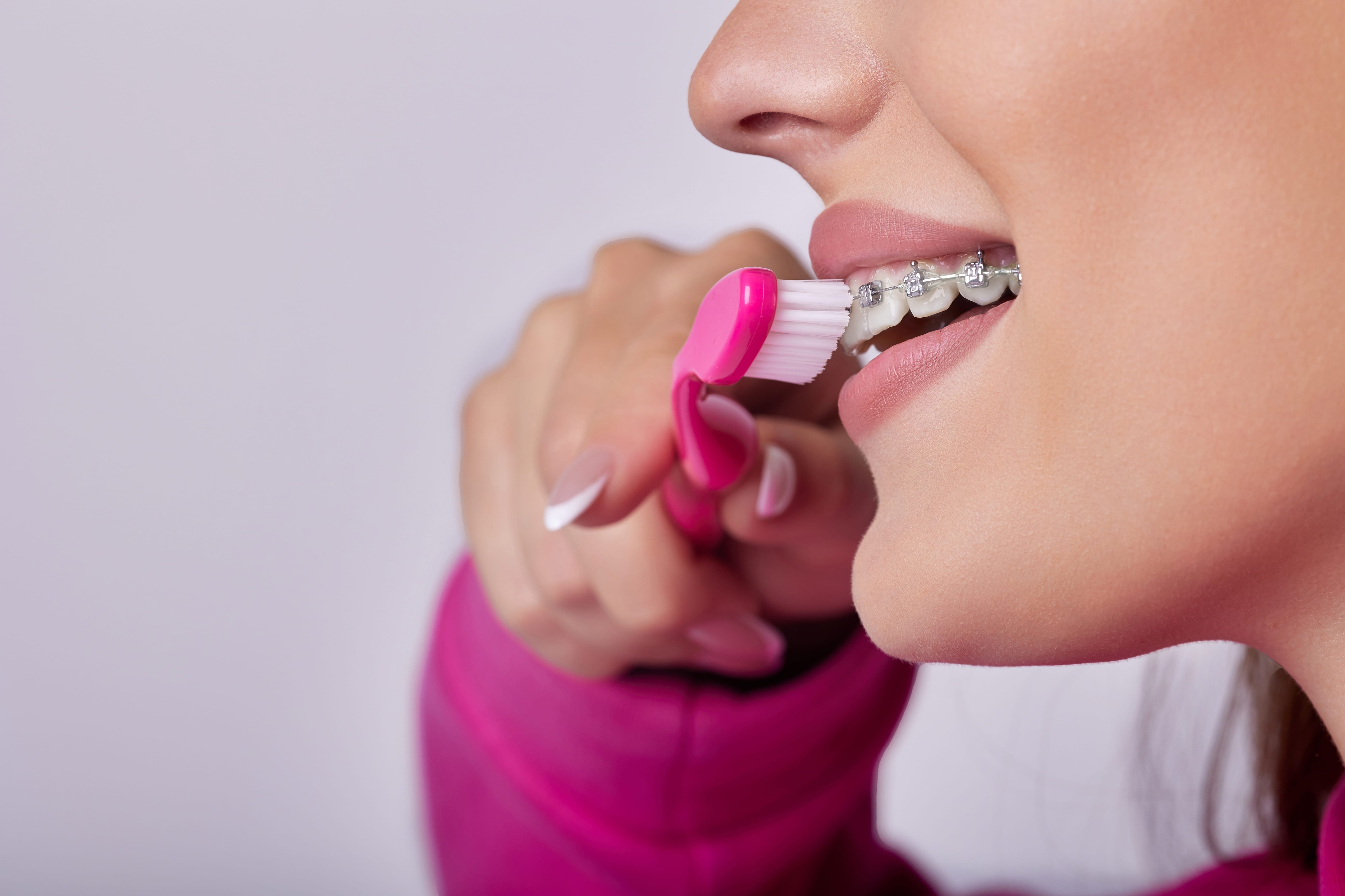 Eine feste Zahnspange braucht besondere Pflege, da sich Beläge leicht ablagern.